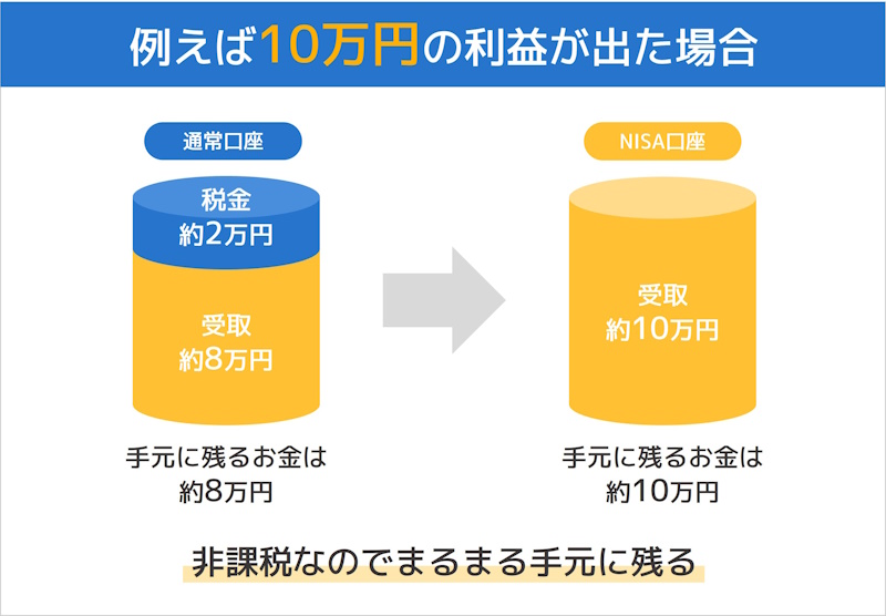 通常、投資で利益が出ると、その利益に対して税金がかかりますが、NISA口座を利用すれば利益をそのまま受け取ることができます。